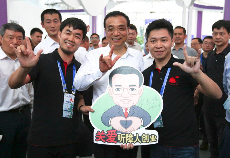 2016年10月12日下午全國(guó)雙創(chuàng)周深圳主會(huì)場(chǎng)上動(dòng)人的一幕。李克強(qiáng)對(duì)這一創(chuàng)業(yè)團(tuán)隊(duì)給予特殊關(guān)注,并應(yīng)邀在“關(guān)愛(ài)聽(tīng)障人創(chuàng)業(yè)”畫(huà)板上簽上自己的名字。(資料圖)