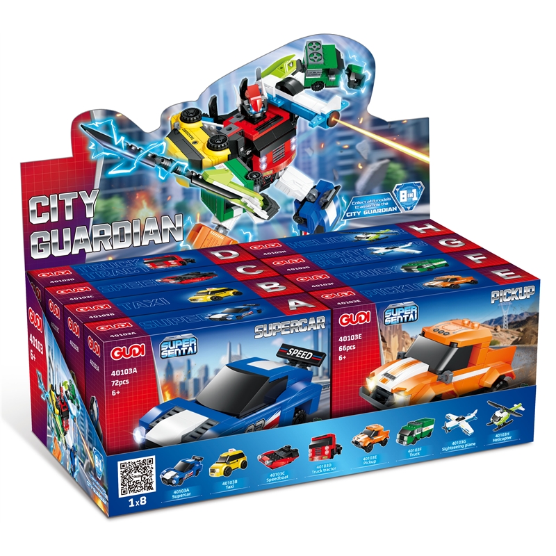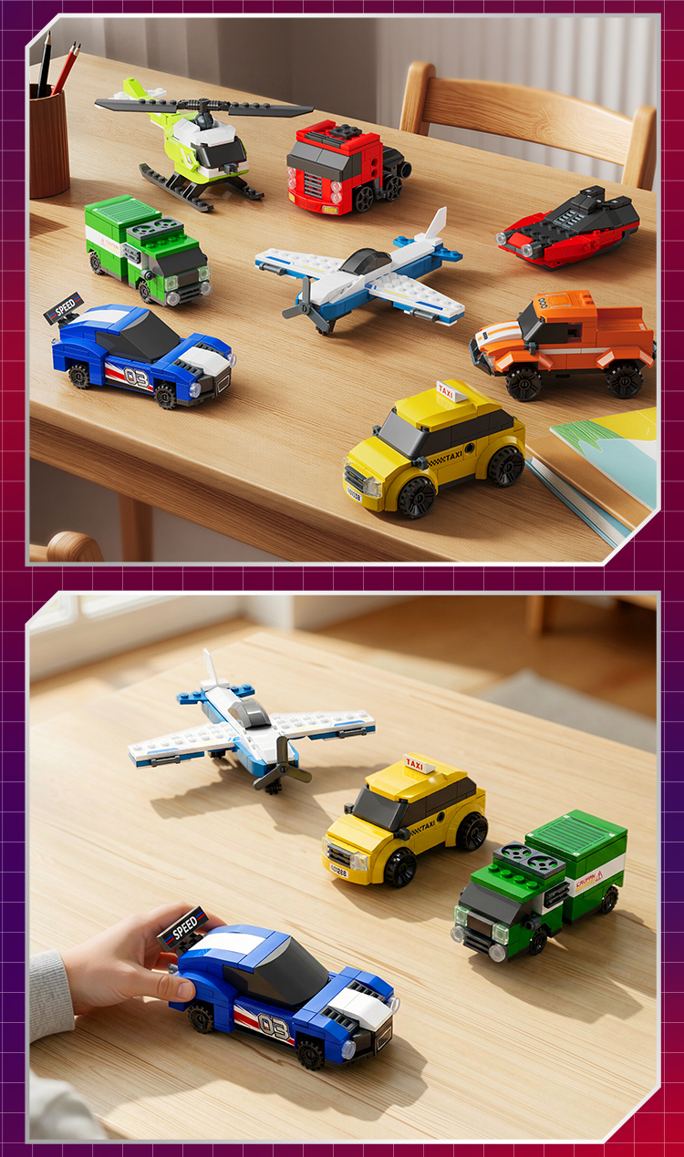 - Description:40103A-Sports car-72PCS; 40103B-Taxi-62PCS; 40103C-Speed boat-76PCS; 40103D-Tractor-73PCS; 40103E-Pickup truck-66PCS; 40103F-Van-83PCS; 4010G-Sightseeing plane-69PCS; 40103H-Helicopter-74PCS